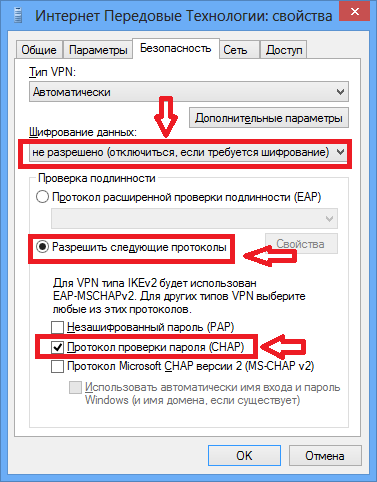 В окне свойств подключения перейти во вкладку «Безопасность» и настроить необходимые параметры. Для этого установить «Шифрование данных» в «не разрешено (отключиться, если требуется шифрование)» и в протоколах проверки подлинности указать только Протокол проверки пароля (CHAP):