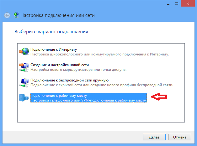 Выбрать пункт «Подключение к рабочему месту» и нажать на кнопку «Далее», чтобы перейти к следующему шагу: