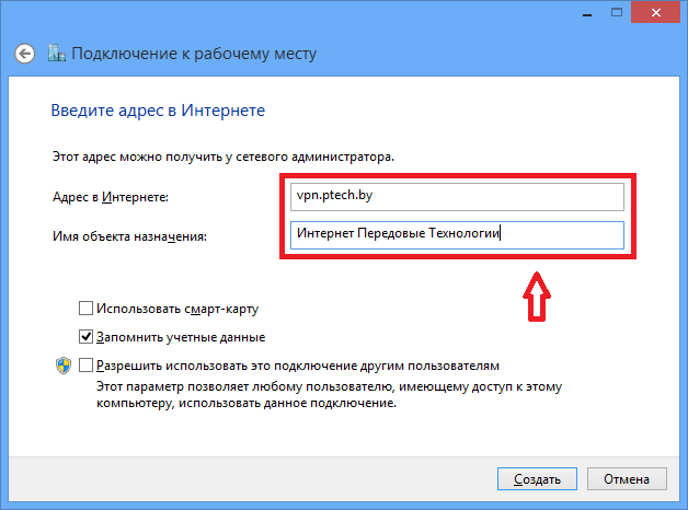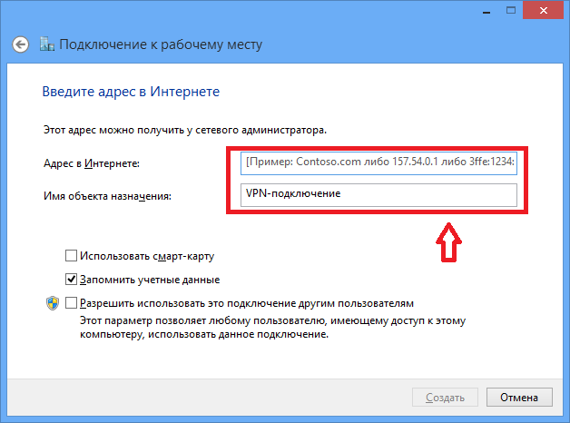Заполнить поля «Адрес в Интернете» (адрес VPN-сервера) и «Имя объекта назначения» (название подключения на компьютере):