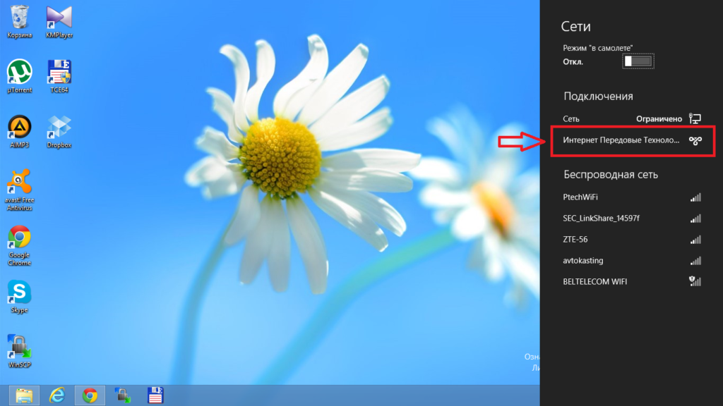 В случае успешного подключения в разделе «Сети» напротив подключения «Интернет Передовые Технологии» должна быть надпись «Подключено»: